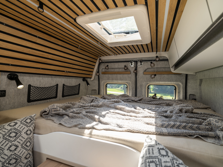 Dévoilé en août 2023, le Weinsberg CaraLife a tout du fourgon d‘artisan ou d’amateur, mais avec la caution d’une marque réputée. Les choix faits lors de sa conception sont audacieux pour un produit industriel : cabine séparée à trois places, grand lit longitudinal à l’arrière, table escamotable encadrée par deux larges sofas au centre, et grande cuisine en L adossée à la paroi de la cabine. Sous le plancher, à demeure donc, se cache une douche chaussette (rideau et douchette se rangent dans le bac intégré) qu’il suffit de déployer pour les ablutions. L’ensemble se pare des gimmicks de l’esprit #vanlife avec lattes de bois sur la paroi gauche et le plafond, équipements noir mat (évier, mitigeur…) et accessoires (pendule, patères, étagères…) à fixer aux lattes susnommées. Depuis peu, le CaraLife peut disposer d’un toit relevable avec lit pour deux.
