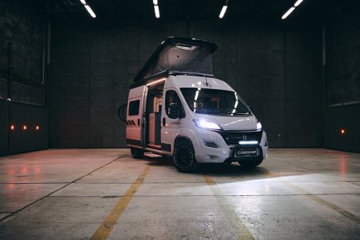 Habitué des petits vans à toit relevable, CrossCamp a présenté l’été dernier une gamme inédite de fourgons parmi lesquels l’étonnant Flex 541 et ses quatorze configurations. Grâce à un aménagement quasiment amovible dans son intégralité, il joue la partition de la polyvalence. A bord, seule la partie réchaud de la cuisine reste à demeure, ainsi que le meuble de rangement à l’arrière. Tout le reste est amovible, à l’instar du grand sofa longitudinal côté gauche qui se transforme en couchage grâce à des sommiers peigne. Il peut se rabattre contre la cloison et découvrir ainsi les deux sièges route indépendants et repliables optionnels, disposés face-à-face. Une douche chaussette et une penderie textile suspendue, qui profitent des mêmes points d’ancrage au pavillon, viennent compléter la dotation. La partie évier de la cuisine est, elle, amovible, obligeant à des réserves d’eau limitée (10 l pour l’eau propre et autant pour les eaux usées. Le Flex 541 peut profiter d’un toit relevable avec lit intégré.