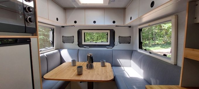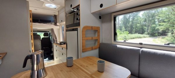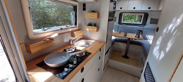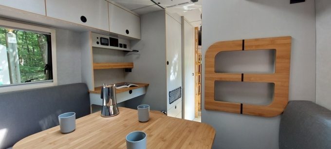 A bord en revanche, le travail est le fruit du talentueux aménageur et ébéniste Brisebras basé pour sa part à Roanne. Sur ce véhicule, l’implantation se veut conviviale. On retrouve donc sur ce modèle un grand salon arrière en U. Rappelons que chaque véhicule est réalisé sur-mesure selon les besoins de clients. Pour cette raison, sur le véhicule visible ici, on soulignera le petit bureau installé dans le prolongement de la banquette sur le flanc gauche pour un télétravail hors du commun en changeant de cadres extérieurs quand bon vous semble. Pour le couchage, le choix a été porté au-dessus de la double cabine. A la manière d’une capucine en somme.
