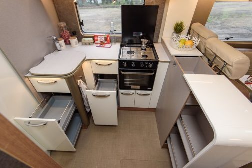 Contrairement à un profilé classique doté d'un lit de pavillon, le choix de cette chambre modulable en capucine autorise parfaitement une utilisation simultanée de l'espace nuit et de l'espace jour. Le salon salon occupe une place de choix et offre également un agréable confort. Il se compose d'une banquette en L associée aux sièges pivotants de la cabine. Le tout prend évidemment place autour de la table sur pied central. Cet espace s'accompagne en prime d'un bel escalier sur le flanc droit du véhicule qui sert évidemment à grimper au niveau supérieur, mais également à dissimuler de nombreux rangements. Ce camping-car Duplex joue pleinement la carte de l'optimisation de chaque espace avec pour autant, des postes spacieux. C'est le cas de la cuisine dont la dimension impressionne. En forme de L, voire de U grâce à la rallonge, elle profite de nombreux plans de travail malgré la présence d'une gazinière 3 feux/four sur le modèle de l'essai (en option) et d'un évier inox circulaire.