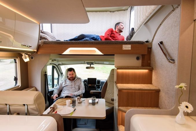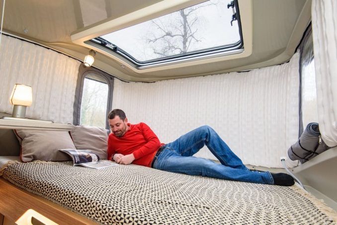 Avec sa gamme de deux modèles atypiques Lyseo Gallery, Bürstner démontre que l'univers du camping-car est encore riche d'innovation (pour notre plus grand plaisir, ne le cachons pas). En effet, ce profilé se transforme en capucine à l'étape sans effort et en un temps record. Il suffit de moins de deux minutes pour que la toile se gonfle et permette l'ouverture et le maintien de la partie avant. La conséquence de cette manipulation est évidemment le fait de pouvoir disposer d'une très GRANDE chambre au-dessus du poste de conduite. Comme les capucines ! Les occupants profitent d'un vaste matelas de 150 x 200 cm avec un tirant d'air époustouflant de 1,16 m a minima. Fidèle à l'esprit cocooning insufflé par Bürstner, le choix du matelas Bultex et le sommier de mousse en nid d'abeille contribuent à ce bien-être à bord.