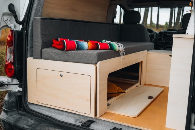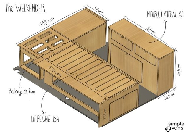 Aujourd’hui, Simple Vans compte dans son catalogue les kits The Roamer avec cuisine (1 799 €), The Nomad polyvalent et confortable (1 899 €), The Drifter pour les novices (1 599 €), The Seeker pour les plus sportifs (1 129 €), The Minimalist au style épuré (1 099 €) et le dernier-né, The Weekender. Revendiqué comme minimaliste mais néanmoins confortable, cette nouveauté présente la grande particularité d'afficher un prix très attractif de seulement 949 €. D'un poids de 30 kg seulement, ce modèle propose un lit peigne de 112 x 162 cm convertible en banquette. Cette assise s’accompagne d’un meuble latéral qui peut intégrer deux réservoirs d’eau de 12 l. Il se destine aux “petits” utilitaires (ludospaces) et transforme en un tournemain un simple fourgon en véhicule de loisirs.