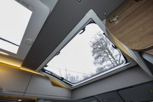 Sans grande surprise, ce profilé dispose d'un salon sur la partie avant. La dînette se compose d'une banquette face route homologuée pour deux personnes au roulant, sans oublier les sièges pivotants du porteur Volkswagen. On bénéficie ainsi d'un poste pour quatre personnes à l'étape. Toutefois, la surface de la table et de sa rallonge additionnelle montre leur limite et conviendront davantage à trois personnes. A l'étape, le skyroof ouvrant associé au lanterneau panoramique apporte une belle luminosité à bord. Ces deux équipements sont prévus dans la dotation d'origine du modèle dans sa configuration Vansation.