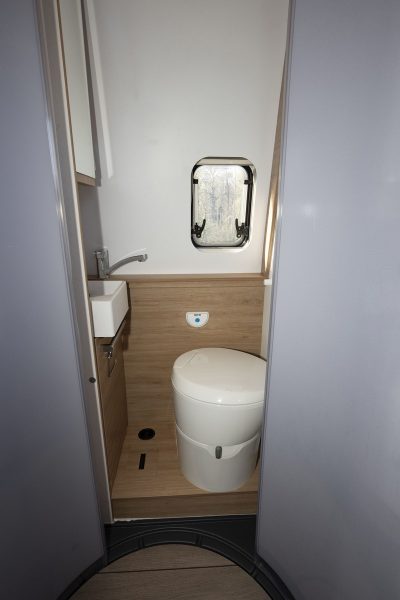 Sur ce registre, le BoxDrive affiche sa différence en utilisant le couloir de circulation pour y intégrer le receveur. L'isolation de la douche s'effectue avec les parois amovibles bombées. Le cabinet de toilette bénéficie d'un WC et d'un lavabo fixe. Ce fourgon embarque d'ailleurs des réserves d'eau propre et d'eaux usées de respectivement 100 et 80 l.