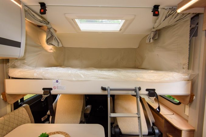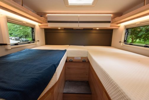Ce véhicule permet ainsi de séduire les adeptes de compacité mais qui pour autant ne veulent pas faire l'impasse sur une chambre spacieuse. Ainsi, cet intégral profite de couchages confortables et aux dimensions généreuses (85 x 195 cm). L'ensemble peut être réuni pour ne former qu'un grand lit de 155 x 200 cm. La position assez haute des sommiers est propice évidemment à la présence d'une soute garage en partie arrière. En optant ici pour un intégral, on profite également d'un lit de cabine double au-dessus du poste de conduite (150 x 185 cm).