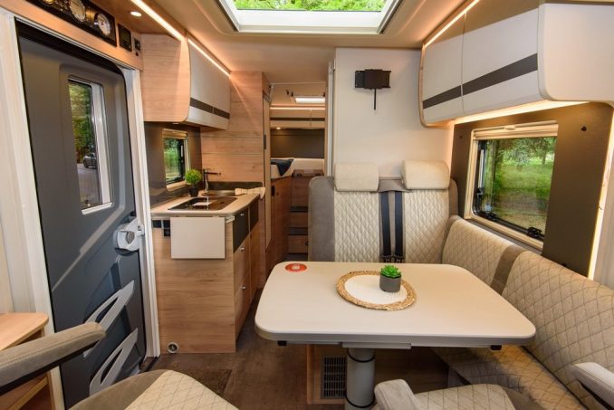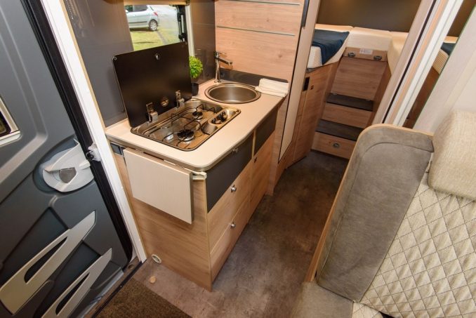 La partie avant est commune aux trois modèles avec une banquette en L associée aux sièges pivotants du porteur. Il s'agit d'ailleurs d'un Fiat Ducato. La table est montée sur un pied central. La salle d'eau de cet intégral I4 adopte le système Vario avec une paroi pivotante qui permet de passer d'un cabinet de toilette à une douche très rapidement et facilement. Enfin, le meuble cuisine profite de tous les équipements nécessaires avec un réchaud 2 feux et surout un frigo de 137 l. Ce dernier fait d'ailleurs office de démarcation entre la zone de vie et la chambre arrière.