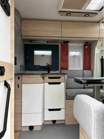 A l’intérieur, Rapido a installé un mobilier classique (Luceo), mais lui apporte une touche de modernité en contrastant avec quelques éléments noir mat, comme les poignées de porte, les enjoliveurs d’interrupteurs, les spots de pavillon. A noter également dans le salon, le revêtement inédit du plateau de table. Cette déco offre du caractère et distingue ces profilés étroits des modèles sortis les deux années précédentes.