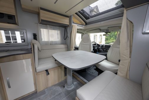 Un constat valant également pour le coin salon, situé juste derrière le poste de pilotage du camping-car. Sa banquette face à face apparaît confortable en plus d'être accueillante, avec un total de cinq personnes pouvant deviser de la journée passée ou à venir. La table suit le même mouvement, en étant spacieuse. Et l'ambiance intérieure, alternant entre un revêtement en bois sur le mobilier et des parties plus sombres, se montre aussi élégante, sobre que chaleureuse. Un sentiment encore rehaussé par la présence de la sellerie Macadamia de notre modèle en essai, une option par rapport à la sellerie Pepper de série.