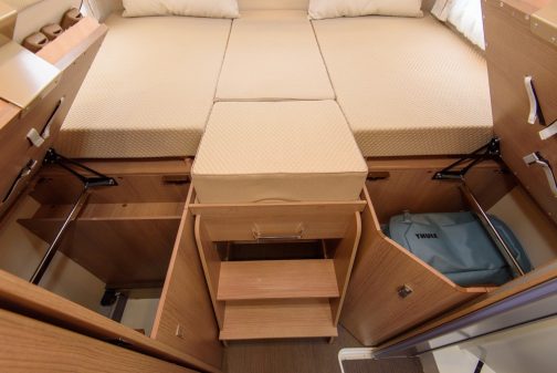 Avec son c-tourer T145 RB-LE, Carthago fait la part belle aux lits indépendants en chambre arrière. Fidèle à l'image de marque, le confort des couchages est agréable avec des matelas de 12 cm d'épaisseur et des dimensions de 82 x 186 cm (à gauche) et 82 x 195 cm (à droite). Malgré le fait d'avoir perché les sommiers à 1,10 m du plancher, l'accès reste aisé grâce à l'escalier central. A noter d'ailleurs que toute cette partie coulisse pour réunir l'ensemble en un grand couchage de 155 x 215 cm... sans perdre cette facilité d'accès.