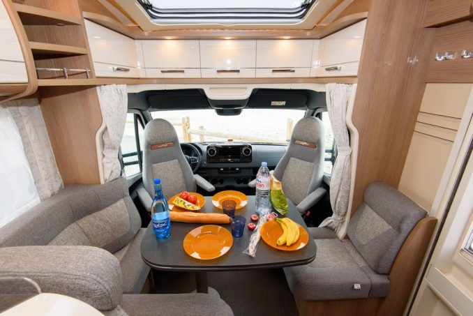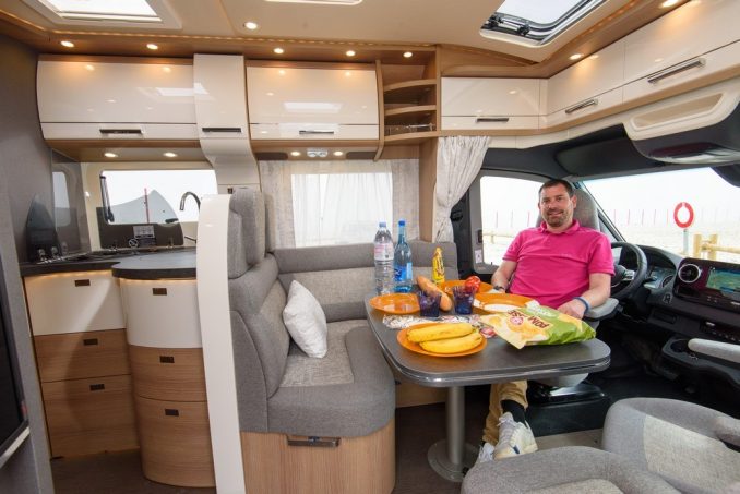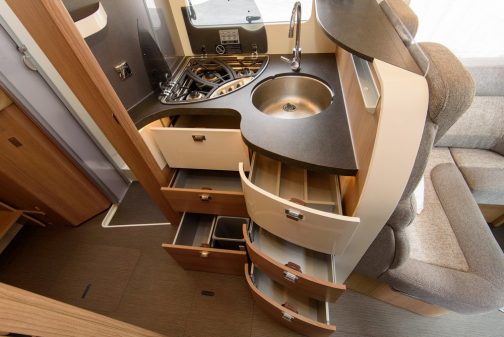 En partie avant, ce profilé se distingue par son vaste salon avec sa banquette face route et son retour en L, les sièges du porteur et un petit sofa latéral au niveau de la porte d'entrée de la cellule. L'ensemble est confortable et permet ainsi à 4 (voire 5) personnes de prendre part autour de la table. En revanche, cette zone n'est homologuée que pour quatre personnes au roulant. La cuisine est logée derrière le dossier de la banquette. Ces courbes affichent un design travaillé et on apprécie la profondeur du meuble. Une fois encore, les rangements sont à souligner sur ce poste avec des tiroirs nombreux et volumineux. Tous les équipements sont présents avec un réchaud trois feux, une cuve inox sans oublier le grand frigo qui fait face à cette cuisine.