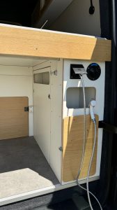 La cuisine accueille une gazinière deux feux et un frigo de 90 l. Le réservoir contient 100 l d’eau propre et alimente également une douchette extérieure. Le van est équipé de toilettes sèches portables Boxio.