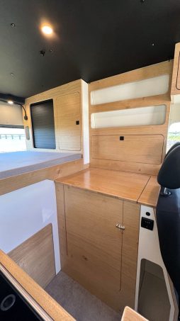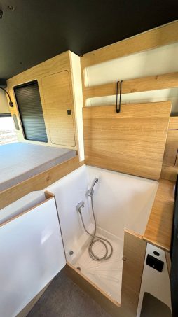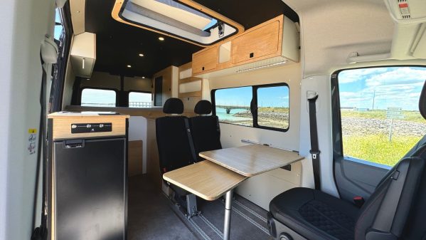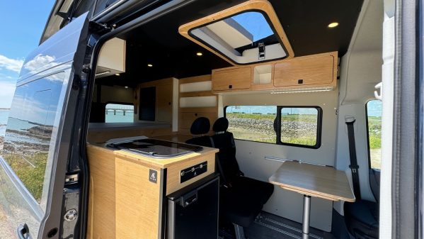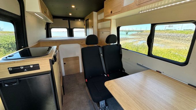 L’intérieur est chaleureux grâce à l’utilisation d’un contreplaqué allégé stratifié couleur bois brut. Pour le confort lors d’escapades au long cours, l’aménageur a intégré un système combiné chauffage et chauffe-eau instantané. Des petites astuces visent aussi à rehausser l’expérience de voyage comme la douche cachée sous le plan de travail. Notons que les sièges avant sont pivotants et la table extensible permet de partager un repas à quatre.
