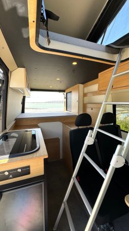 Le van intègre quatre couchages, avec un lit sous le toit relevable et un autre dans la cabine, type lit peigne. L’aménagement homologué VASP est tourné vers l’autonomie avec une grande ressource en eau, électricité et gaz. Ainsi, le véhicule conviendra parfaitement aux aventuriers et aux amateurs de sports de plein air. Il dispose également d’une grande soute qui permet de ranger une voile et une planche de kitesurf par exemple.