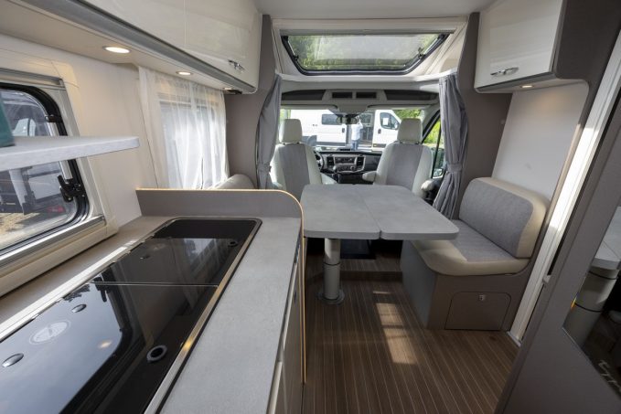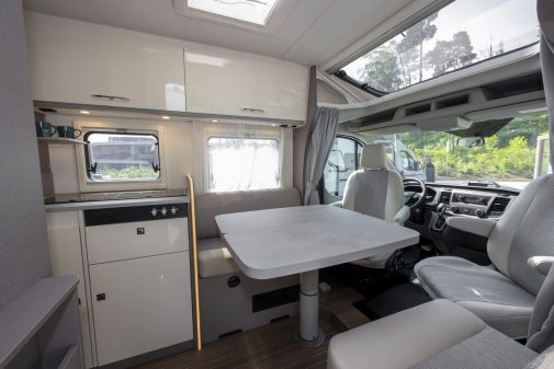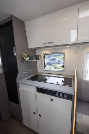 La cuisine s'intègre parfaitement dans ce véhicule de 6,83 mètres de long. Sa couleur blanche contraste bien avec le bois du sol et la sellerie gris claire du salon. Ses caractéristiques techniques sont simples mais efficaces, avec la présence de deux feux et d'un évier, le tout dans un seul et même bloc. Les opérations de découpes, en revanche, se dérouleront sans doute sur la table du salon. Trois placards, enfin, permettent de stocker tout le nécessaire pour prendre un bon petit déjeuner le matin ou envisager un repas plus copieux ou sur le pouce à un autre moment de la journée, entre deux visites.