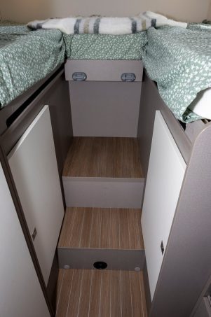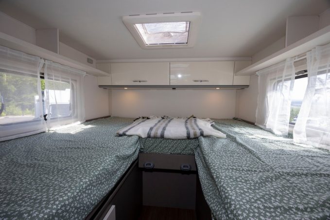 La chambre reprend les qualités de l'ensemble du véhicule : une luminosité agréable grâce à des baies présentes de chaque côté des lits jumeaux ainsi qu'un lanterneau central, un accès au lit simple et aisé grâce à deux petites marches pour accéder aux bras de Morphée. Sans oublier plusieurs espaces de rangements, pour une fonctionnalité se voulant, là aussi, la plus pratique possible.