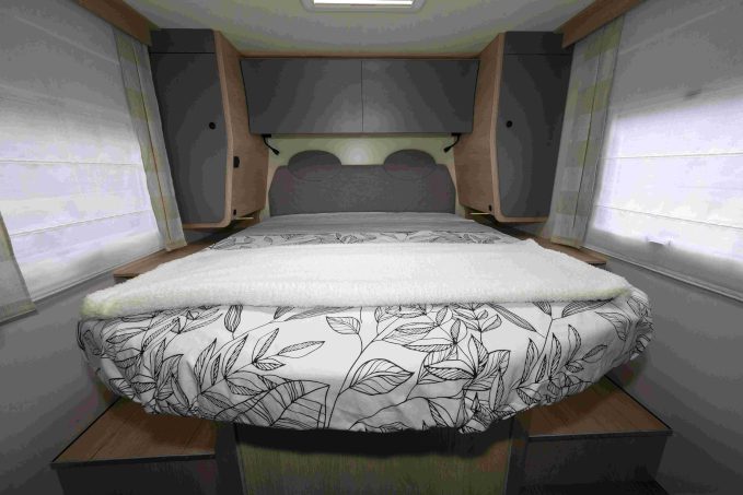 - Le lit central est perché sur une soute de 110 cm de haut dans laquelle on peut aisément entreposer deux vélos, voire un scooter. L’accès à ce couchage est simplifié par la présence de marches à droite et à gauche.