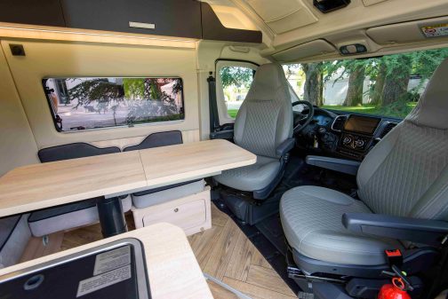 Enfin, la dînette peut également se convertir en couchage simple. Le salon affiche une certaine originalité dans sa conception puisque Challenger a décidé d’y incorporer une banquette face route avec un long retour le long de la paroi. Associés aux sièges pivotants du porteur, cet ensemble peut prétendre accueillir cinq convives autour du plateau de table dépliable. Pour la route, la banquette en L se transforme pour accueillir deux personnes dans le sens de la marche et une installée dos à la route.