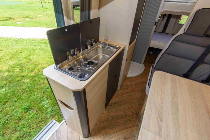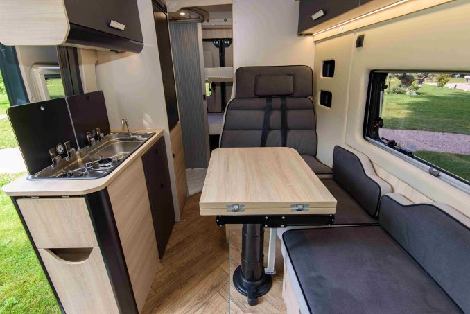 Pour autant à bord, le constructeur ardéchois a fait preuve d’originalité pour permettre un programme pour 5 autant au roulage qu’à l’étape. Ainsi, la partie arrière est occupée par des lits superposés transversaux autorisant donc deux enfants à dormir. Les sommiers sont toutefois amovibles pour libérer l’espace. En pavillon, ce F&S bénéficie d’un toit relevable monté de série dissimulant un vaste lit double.