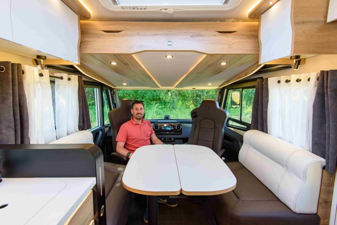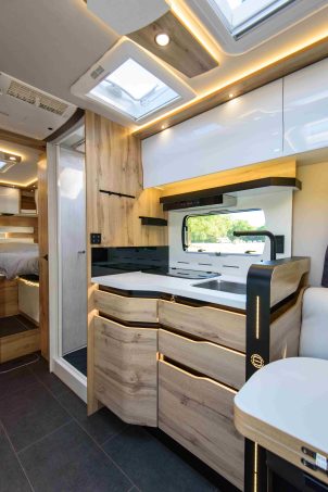 Si la partie arrière est reprise du 7.9, l’avant pour sa part a dû faire des compromis notamment sur la taille du salon. Rassurez-vous pour autant, le confort est réel et l’utilisation pour 4 personnes possible. Le coin repas se compose de deux banquettes en vis-à-vis et des sièges pivotant du Mercedes. L’ensemble est surmonté d’un lit de cabine de 140 x 190 cm. Sur le modèle de l’essai, le mécanisme électrique et la possibilité de rallonger la surface du lit est en option. La cuisine a également été réduite mais conserve un beau volume de rangement ainsi joli plan de travail devant le réchaud 2 feux.