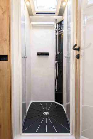 Pour être tout à fait honnête, ce 7.6 ne part pas d’une feuille blanche. Bien au contraire ! Le Voyageur aurait tort de se priver de postes maitrisés et appréciés. C’est pour cela que cette nouveauté reprend à l’identique la chambre de son grand frère, le 7.9 GJF. On dispose donc de lits jumeaux de 80 x 200 cm sur soute garage d’une hauteur constante de 1,10 m, voire 1,20 m en optant pour l’option « lits hauts ». Cette zone nocturne s’accompagne d’une salle d’eau en deux parties avec pour chacune, un espace ample et appréciable. La douche est un modèle du genre avec de l’espace et un plancher totalement plat. Ces deux éléments dissociés peuvent toutefois être réuni en transversal pour offrir plus d’aisance à l’usage.