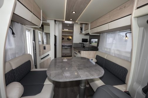 Les deux modèles disposent cependant de la même capacité, en étant homologués en quatre places carte grise et trois places couchages. Sinon, hormis les lits, tout est pareil. Le bloc cuisine se situe à l'entrée du véhicule, à gauche, avec un frigo dans son prolongement. Le coin dinette, à l'avant, reprend ce qui se fait déjà depuis plusieurs années sur le marché, avec une banquette face route de deux places et deux sièges de cabines pivotants. Alors que la salle d'eau vario permet de créer un espace aussi bien pour la douche que pour les toilettes.