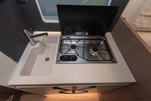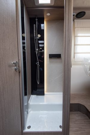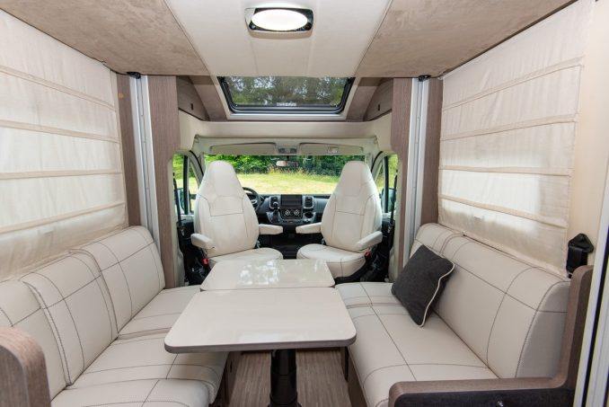 Le marque a également concentré ses efforts sur l'ambiance intérieure des véhicules. Le dessin des meubles suit la tendance actuelle, avec un design plaisant. La décoration est élégante, grâce à une belle harmonie entre les couleurs claires, comme pour le crème des banquettes, et d'autres un petit peu plus sombres, à l'image d'un bois foncé avec des nervures sur le bloc cuisine ou dans la salle de bain. De quoi affronter sereinement les jours de pluie.