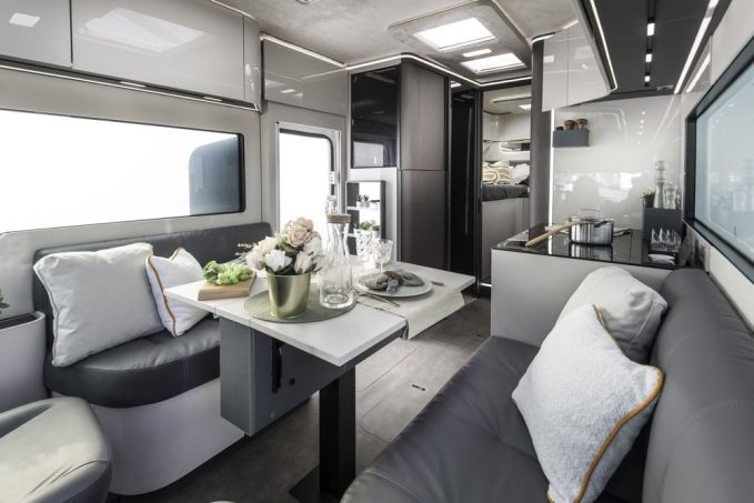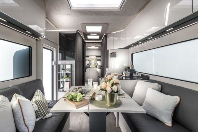 A bord, difficile de ne pas remarquer les grandes baies intégrées aux parois réalisés sur-mesure. Ici point de stores occultants, mais des vitres qui se teintent pour une opacité totale. N’oublions pas non plus le toit panoramique dans la casquette de l’intégral pour apporter une grande luminosité. La « fluidité », sert également à qualifier les lignes continues et sinueuses de l’ameublement.
