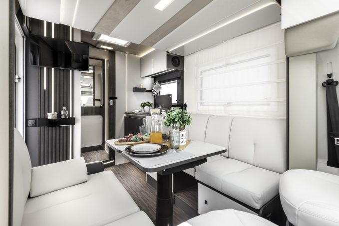 Dans les cellules de ces deux Kompakt, l’ambiance est singulière et tranche littéralement avec les autres modèles de la marque (profilés et intégraux). Cette gamme fait preuve de sobriété et revendique même un style minimaliste appréciable. L’absence de poignées sur les placards offre une continuité visuelle de l’espace de vie jusqu’à la casquette de profilé. L’ensemble magnifiquement travaillé est très harmonieux. Et que dire de la somptueuse cuisine qui dévoile des finitions soignées et l'utilisation de matériaux performants, à l'image du plan de travail en pierre acrylique.