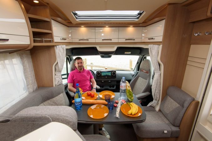 Le 145 RB LE mesure 2,27 m de large et 2,95 m de haut. Cette dernière dimension nous a donné quelques sueurs froides dans les gorges de la Nesque, non loin du mont Ventoux, avec des passages creusés à même la roche, aussi magnifiques qu’inquiétants. Pour autant, elle permet de profiter à bord d’un tirant d’air optimal malgré la présence du double-plancher. En effet, dans la cellule, on bénéficie d’une hauteur sous pavillon de 1,95 m. Et l’absence de lit haut contribue indéniablement à cette sensation d’espace. Les occupants profitent également d’un habitacle baigné de lumière grâce aux nombreux ouvrants, dont le skyroof dans la casquette. Dommage qu’il soit proposé en option au prix de 1 395 €.