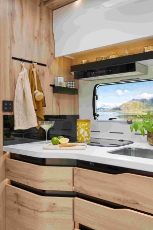 Pouvoir préparer de bons petits plats à bord est essentiel pour tous les camping-caristes. La cuisine se doit donc d'être pratique et facile à entretenir. C'est le cas dans les Héritage où le plan de travail du bloc cuisine est confectionné dans une résine blanche très robuste qui concourt à l’élégance de la cuisine.