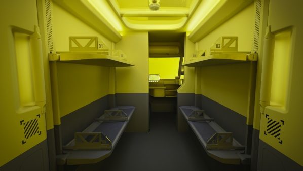 A bord, le tableau de bord jaune reste criard, mais gageons qu’il ne s’agisse ici que d’une étude de style pour mettre en « lumière » le poste de conduite. Structurée en deux parties, la planche de bord de l’Estafette Concept développe un espace techno sans visière autour du volant, avec un écran 7’’ pour le tableau de bord et un grand écran 12’’déporté sur la droite mais orienté vers le conducteur. Aux extrémités de la planche bord, deux écrans verticaux de 10 pouces affichent les images de rétrovision captées par les caméras externes.