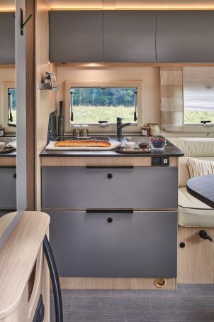 Le bloc cuisine est profond. De cette manière, on profite de vastes tiroirs de rangement mais aussi d'un grand plan de travail au devant du réchaud à deux feux et de l'évier. Au moment de faire la vaisselle, il conviendra toutefois de prendre garde aux projections d'eau qui risquent de gicler sur les coussins de la banquette du salon.