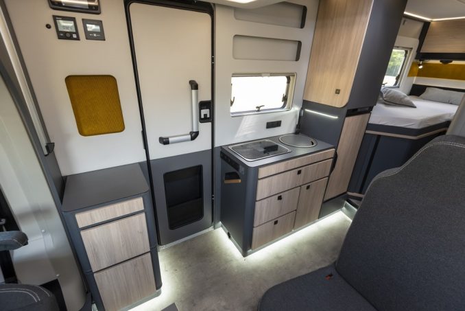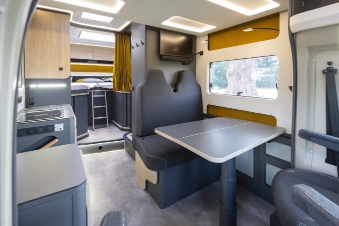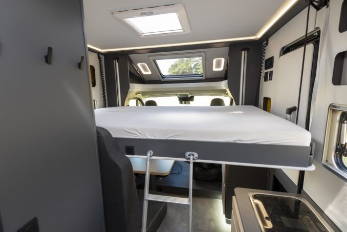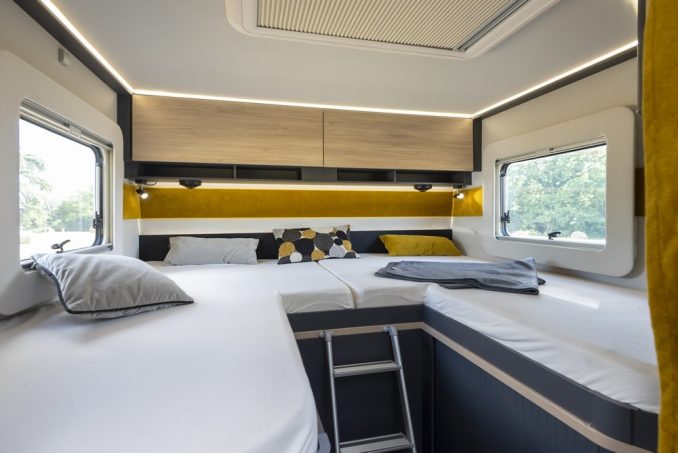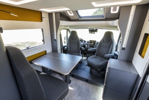 L'espace est le maître-mot recherché par les ingénieurs à l'image de l'habitacle très aéré. La partie avant est totalement consacré à l'espace dînette avec une banquette face route et les sièges du porteur. Une penderie au niveau de l'entrée de la cellule sert de rangement évidemment. Mais, pour faire d'inventivité, la partie supérieure est aimanté et peut se désolidariser de sa base afin de dévoiler un pouf complémentaire pour un cinquième convive. En partie arrière, ce profilé reçoit de lits séparés avec un accès au centre. Le confort est bon et le traitement en chambre flatteur. Les sommiers abritent des espaces de rangements également et surmontent une soute garage.