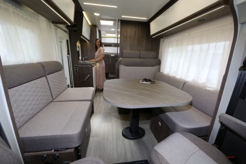 La gamme Tessoro Up compte trois profilés, toujours sur Ford Transit. L’appellation “Up” signifie que ces modèles sont accessoirisés et qu’ils sont, par conséquent, prêts à partir (chaque véhicule reçoit un store extérieur, un panneau solaire de 165 W, un écran TV avec antenne, un kit de départ comprenant rallonge électrique, tuyau, cales, liquide WC…)