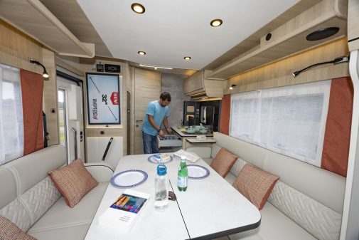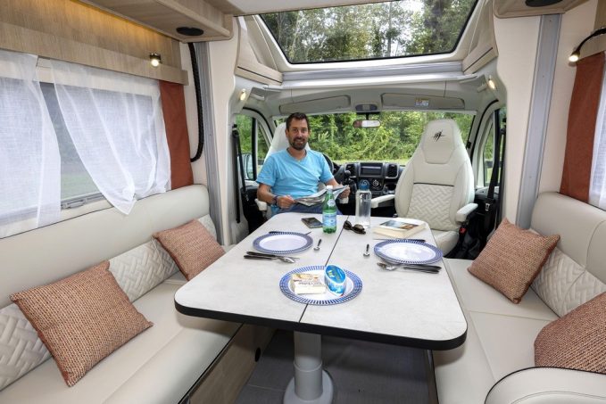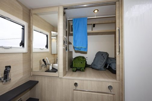 On retrouve donc un très grand salon. Il se compose de banquettes en vis-à-vis de bonnes dimensions à la fois sur la largeur mais aussi sur la profondeur. Ce coin repas peut prétendre recevoir 5 à 6 convives sans aucun souci de places. Sous les banquettes, Rapido a dissimulé des sièges homologués pour la route et permettant ainsi à deux passagers de voyager dans le sens de la marche. Cet espace est surmonté d'un vaste lit de pavillon de 146 x 191 cm commandé électriquement. Que ce soit en configuration diurne ou nocturne, le grand skyview monté de série offre une belle clarté à bord, mais qui peut toutefois être occulté grâce au rideau à lamelles. En partie arrière, ce profilé accueille une grande salle d'eau occupant toute la largeur du véhicule. On y trouve dans cette zone, une douche séparée de bonnes dimensions. Viennent en complément, un WC à tête pivotante et un lavabo. En revanche, ce Rapido 606F tire son épingle du jeu dans la gestion du dressing. En effet, pour éviter l'emprise sur l'espace intérieur, les ingénieurs ont opté pour des éléments indépendants et coulissants.