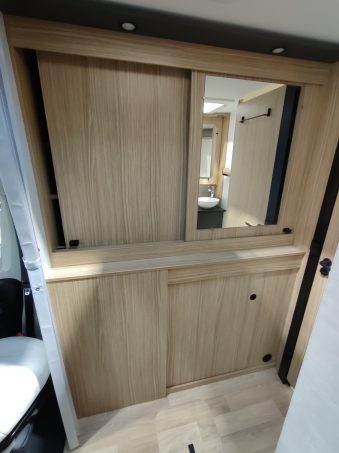 Cette zone est d'ailleurs surmontée d'un grand dressing faisant face au cabinet de toilette, séparé par une cloison de la douche, dont l'agencement se révèle des plus intéressants. Comment ? Grâce à la présence d'un grand miroir, d'une penderie de belle capacité mais aussi de nombreuses étagères. Mais revenons tout de même au salon, qui reste la pièce maitresse de ce profilé d'une longueur de 7,15 mètres.