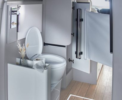 On retrouve par exemple une partie sanitaire en zone arrière avec l’intégration de série d’un WC à cassette et d’un receveur. Westfalia a modifié l’intégration de ce dernier pour le rendre encore plus affleurant au plancher. Cette douche s’accompagne évidemment d’un rideau de protection facile à installer et qui isole parfaitement l'ensemble. Cette partie sanitaire est adossée à une autonomie en eau cohérente avec une capacité similaire de 50 l pour les eaux propres et usées.
