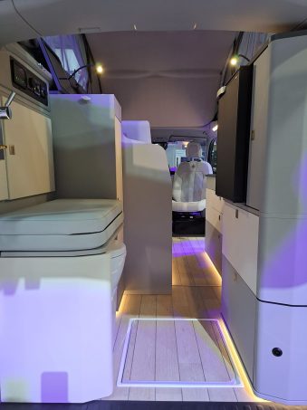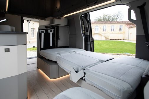 Mais l’innovation majeure est à mettre au crédit du salon avec le développement d’une nouvelle banquette révolutionnaire. Cette dernière rappelle les canapés BZ car elle peut se déplier électriquement pour convertir cette zone en couchage. Par cette opération rapide et d’une simplicité déconcertante, vous obtenez un couchage simple de 90 x 193 cm en moins d’une minute et sans aucune manipulation superflue. Rassurez-vous, dans le cas d’un usage à deux, l’aménageur allemand a trouvé la parade. Des extensions métalliques ont été logées dans les coussins d’assises afin d’augmenter la surface de couchage si besoin passant ainsi sur un lit double de 123 x 193 cm. Avec un tel dispositif, Westfalia marque indéniablement les esprits.