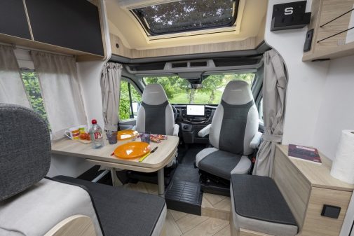 Enfin en partie avant, le salon est prévu pour 4 personnes mais le petit sofa au niveau de l'entrée peut éventuellement convenir à un cinquième convive à l'étape. D'un point de vue tarifaire, ce Chausson S695 (proposé en livrée Sport Line) est commercialisé à partir de 69 990 € avec donc de base la motorisation la plus puissante du Ford (165 ch) associée à la boîte auto nouvelle génération. De plus, cette finition reçoit également le pack Connect (autoradio, caméra de recul...) et le pack Accessoires (panneau solaire, store extérieur...) d'origine. Toutefois, Chausson pour capter une clientèle plus large propose également une "entrée de gamme" baptisée First Line. Logiquement plus basique dans l'équipement et dans l'esthétique (carrosserie grise, calandre classique, jantes classiques...), ce profilé profite d'un prix inférieur de 8000 € qui peut, à n'en point douter, faire réfléchir.