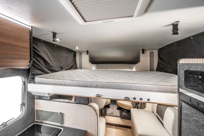 Il est intéressant de souligner que sur les quatorze véhicules présents dans l’offre Sarus, neuf affichent une certaine compacité avec une longueur sous la barre des 7 m. Et s’il y en a pour toutes les tailles, il y en a également pour tous les goûts, puisque Rimor peut se targuer de commercialiser tous les types de couchages présents sur notre marché. Des classiques lits jumeaux ou lit central, s’ajoutent en effet des couchages plus confidentiels comme un lit à la française (logé dans la longueur) ou des matelas superposés… sans oublier évidemment une implantation incontournable de nos jours, dépourvue de lit au plancher, dont les camping-caristes français sont très friands.