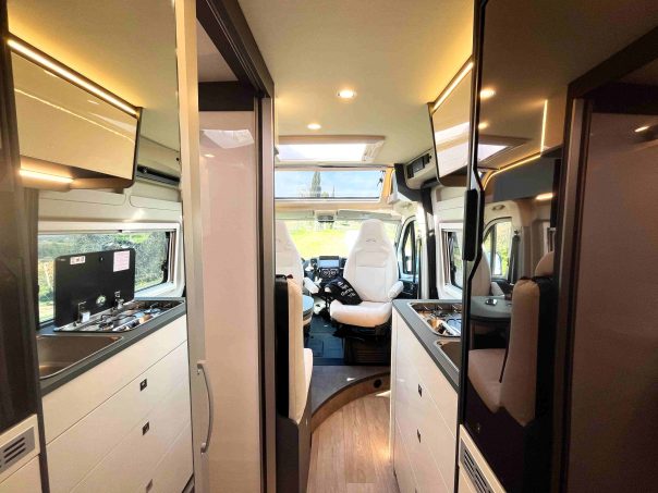 À bord, la marque italienne opte pour des lits transversaux. Le design est contemporain avec un sol couleur bois, des meubles blancs, des sièges clairs et des touches de foncées. Pour l’ouverture des rangements, tout se fait par un système de push-pull. De nombreux meubles sont disposés en hauteur dans la partie chambre. La lumière naturelle s’invite à bord grâce à de grandes baies. Elles sont disposées tant à l’avant du véhicule, qu’à l’arrière et dans la salle d’eau. Un skyview est disponible en option.