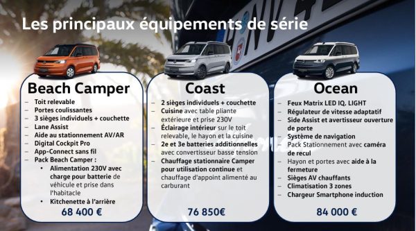 A propos des prix, le modèle de l'essai était évidemment la version la plus "Premium" proposée par le constructeur. Il s'agissait de la finition Ocean avec un prix de base de 84 000 €. Toutefois, regarder vers la finition inférieure Coast à 76 850 € n'est pas une hérésie grâce à son rapport prestation/prix convaincant. Volkswagen commercialise aussi un California plus épuré, qui se passe du meuble latéral avec cuisine, pour profiter de trois sièges individuels convertibles et d'un petit réchaud dans le coffre, à un prix attractif de 68 400 €.