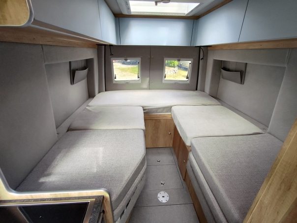 La Strada a pour habitude de faire évoluer ses gammes par petites touches et, surtout, de travailler sur une série à la fois. Cette année, c’est la gamme Regent qui a eu les faveurs de la marque, avec une nouvelle implantation qui vient en complément de cette série sur Mercedes Sprinter. En effet, après avoir lancé il y a deux saisons les Regent S (5,93 m/lit transversal) et le gigantesque et imposant Regent EB (6,97 m/lits jumeaux), le spécialiste allemand du fourgon a développé un véhicule compact pour deux personnes. Place donc à une troisième référence qui reprend un condensé des modèles existants. Le Regent E est en effet conçu sur la longueur de 5,93 m, comme le S, mais en jouant la carte des lits jumeaux à bord, comme le EB. Pour parvenir à un tel résultat, La Strada a choisi de le concevoir pour deux personnes seulement, en se passant par exemple de la classique banquette face route. Ce fourgon est commercialisé à un peu plus de 115 000 €.