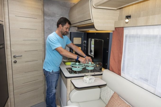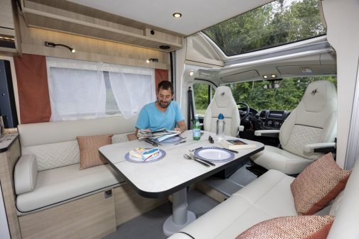 La luminosité qui règne à bord fait que l’on s’y sent bien. D’autant plus que ce living est constitué de deux banquettes latérales en vis-à-vis, chacune dissimulant un siège face route très simple à déplier. Les passagers arrière peuvent ainsi s’installer en toute sécurité, sanglés par les ceintures de sécurité, avant d’entamer les phases de roulage. Ils voyagent donc face à la route et profitent du paysage grâce aux baies latérales. A l’étape, le plateau se déplie de moitié pour créer une table de 110 x 85 cm sur laquelle quatre assiettes peuvent tenir.