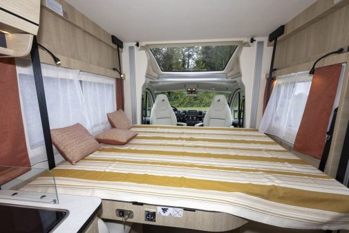 Le couchage principal du 606 F est plaqué contre le pavillon en journée. Le soir venu, il s’abaisse électriquement à la hauteur choisie. Il est notamment possible de le positionner à 75 cm du plancher. Mais dans ce cas, il vous faudra abaisser la table (sur pied télescopique électrique) et ôter le dossier des banquettes. Pour éviter ces manipulations, il est également possible de le placer à mi-hauteur.