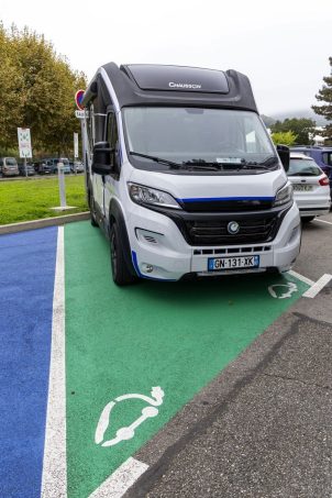 Une fois le camping-­car lancé, il se montre cohérent et les prestations sont quasi équivalentes à celles procurées par le bloc thermique, douceur et souplesse en plus, bruits mécaniques en moins. Du coup, ceux provenant des trains roulants et du mobilier sont plus présents. Un classique sur les véhicules électriques. Au lever de pied et durant les phases de freinage, les moteurs électriques deviennent générateurs, permettant de recharger quelque peu les batteries. Cependant, comme tout véhicule de ce type, il faut le recharger. Soit sur une prise domestique (domicile, aire de services) où il faudra entre une vingtaine et une trentaine d’heures pour faire un plein très économique, ou sur une borne puissante (150 kWh et plus) sur laquelle passer de 20 à 80 % de charge prendra environ 20 mn, mais coûtera bien plus cher. L’autonomie annoncée de quelque 100 km nous paraît réaliste à l’issue de ce galop d’essai d’une centaine de kilomètres dans les reliefs ardéchois où montées, gourmandes en énergie, et descentes, génératrices d’autonomie supplémentaire, se sont succédé. Bien sûr, l’électronique veille au grain, jugulant les trop fortes charges ou décharges au détriment de l’efficience pure, mais au profit de l’autonomie et de la durabilité des cellules de batterie, lesquelles sont garanties 7 ans ou 100 000 km.