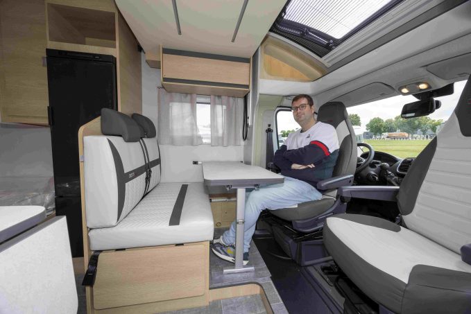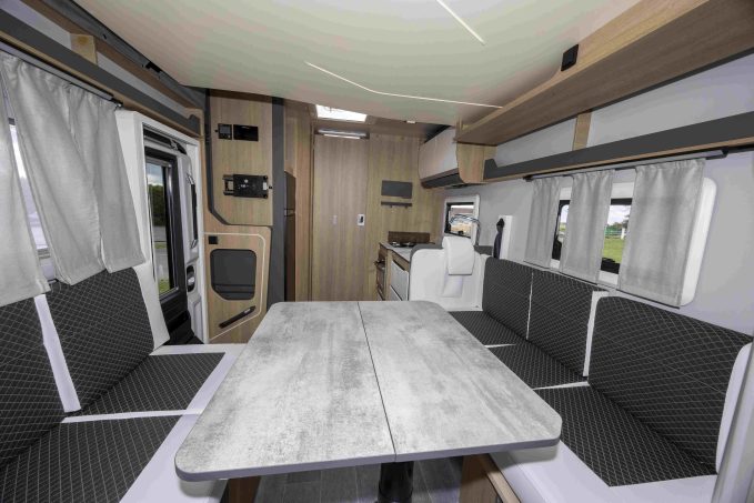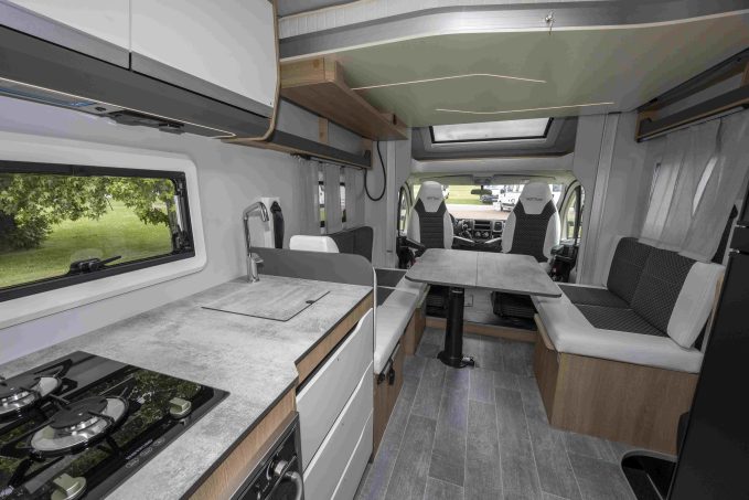A propos de la gamme Siena, les profilés arborent un design extérieur arrière plus épuré avec des feux et clignotants à LED ainsi qu’un nouveau profil majoré en aluminium sur la jonction avec la cabine. Le dessin des capucines a été également revu. Et les ambiances intérieures ont reçu un joli coup de pinceau avec une nouvelle couleur bois, un sol inédit, un nouveau système d’éclairage, des placards redessinés et une cuisine désormais stratifiée, comme la table juste à côté.