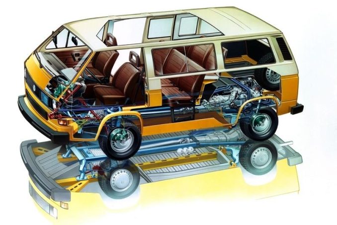 Si le T3 est présenté et commercialisé en 1979, il faudra encore attendre 1985 pour voir arriver sa version à transmission intégrale, baptisée Syncro, un laps de temps nécessaire pour mettre au point le système à quatre roues motrices et assurer une fiabilité sans faille à ces véhicules imaginés pour parcourir le monde dans les pires conditions possibles. Pour développer cette transmission, Volkswagen s’est tourné vers le spécialiste allemand Steyr-Puch qui, en outre, assurera la transformation mécanique dans son usine de Graz, en Allemagne. La transmission aux quatre roues est permanente, un visco-coupleur se chargeant de répartir la motricité entre les essieux. Bien évidemment, certains de ces modèles Syncro ont été aménagés par Westfalia et sont aujourd’hui très recherchés.