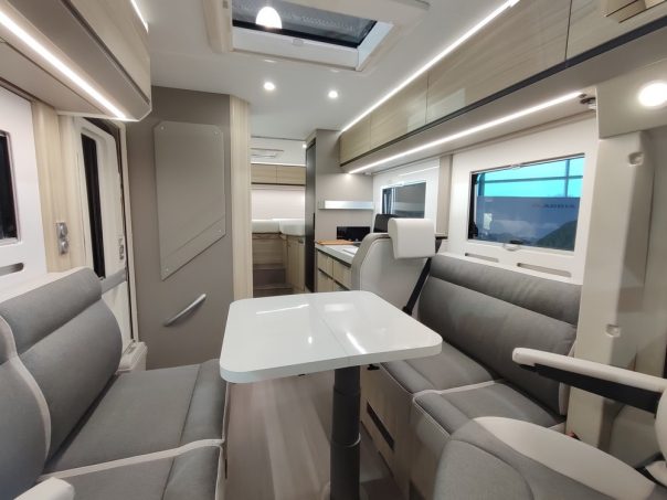 Ce profilé de 7,30 m de longueur bénéficie de toutes les tendances fortes du marché. Ainsi, on retrouve un vaste salon face/face agréable et confortable, une salle d'eau en deux parties pouvant être réunie en une seule grâce à un rideau et enfin un grand lit central. Sur ce modèle anniversaire, Adria a décidé d'intégrer de série un système électrique permettant ainsi de jouer sur la hauteur en soute avec une amplitude d'une trentaine de centimètre.