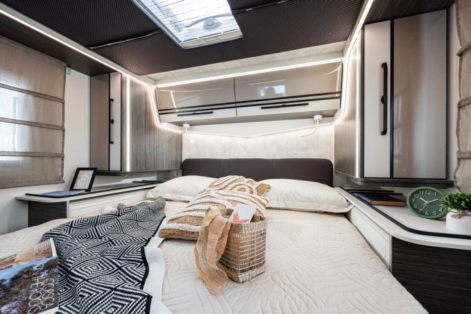 Place donc au Yearling 73 (salon en L et lits jumeaux) et 81 (salon face/face et lit central), deux plans déjà connus sur une longueur commune de 7,45 m. En revanche, le constructeur dévoile une nouvelle signature intérieure avec un contraste de mobilier entre les teintes et les textures avec un blanc mate et un beige Glossy brillant. Sans oublier la sellerie Ebony en similicuir du plus bel effet. L’ambiance intérieure apporte donc de la nouveauté et les responsables de la marque ne cache pas le fait que ce design préfigure l'ambiance de la future série 800 pour la collection prochaine.